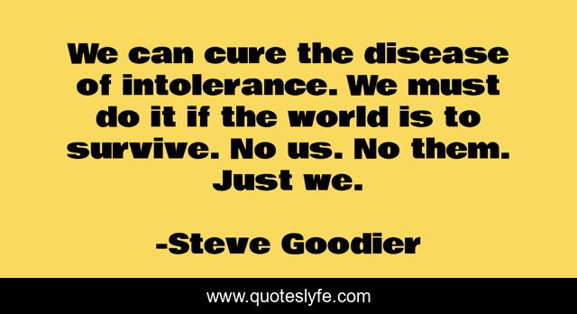 This page presents the quote "We can cure the disease of intolerance. We must do it if the world is to survive. No us. No them. Just we.". Author of this quote is Steve Goodier. This quote is about intolerance, united, tolerance, boundaries, unity, barriers, barriers-in-life, unity-of-all-people, togetherness,.