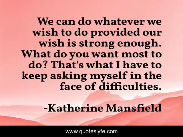 This page presents the quote "We can do whatever we wish to do provided our wish is strong enough. What do you want most to do? That's what I have to keep asking myself in the face of difficulties.". Author of this quote is Katherine Mansfield. This quote is about positive, confidence, motivational, optimistic,.