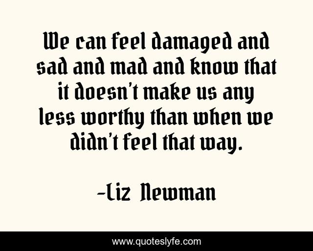 This page presents the quote "We can feel damaged and sad and mad and know that it doesn’t make us any less worthy than when we didn’t feel that way.". Author of this quote is Liz Newman. This quote is about life, sad, self-worth, mad, feeling, worth,.
