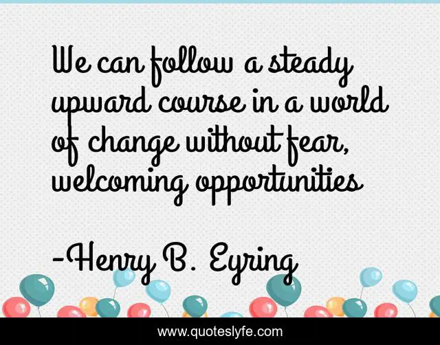 This page presents the quote "We can follow a steady upward course in a world of change without fear, welcoming opportunities". Author of this quote is Henry B. Eyring. This quote is about lds, faith, mormon, inspirational, enthusiasm,.