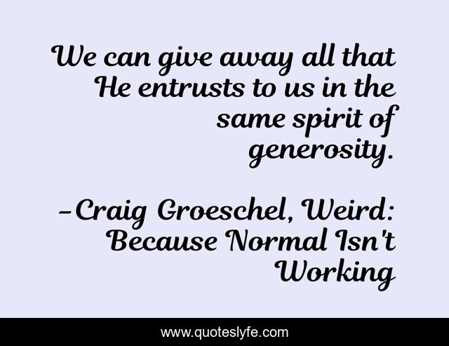 This page presents the quote "We can give away all that He entrusts to us in the same spirit of generosity.". Author of this quote is Craig Groeschel, Weird: Because Normal Isn't Working. This quote is about all, us, give, of, away, entrusts, we, same, to,.