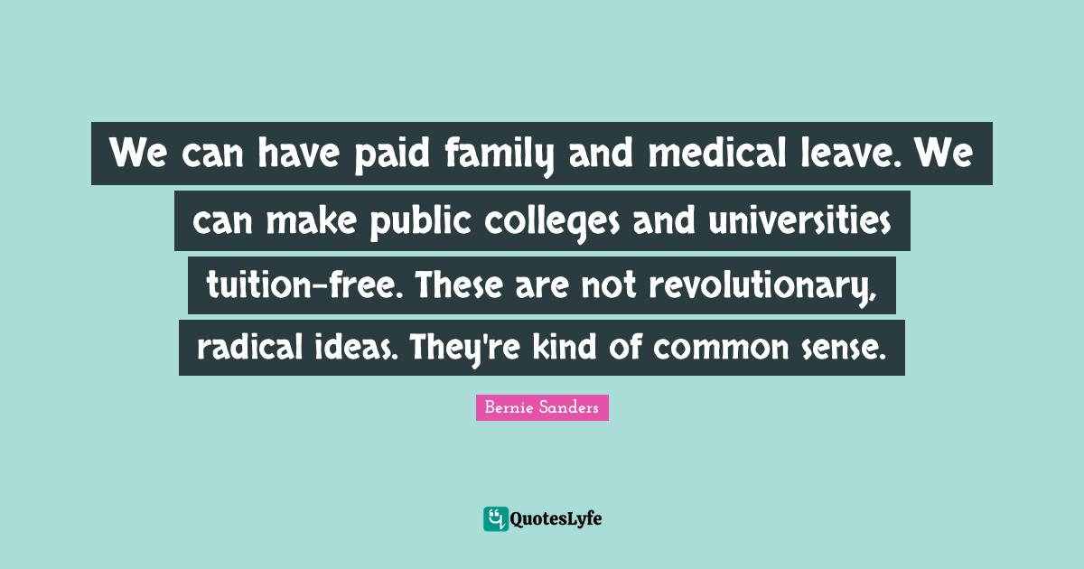 This page presents the quote "We can have paid family and medical leave. We can make public colleges and universities tuition-free. These are not revolutionary, radical ideas. They're kind of common sense.". Author of this quote is Bernie Sanders. This quote is about family, medical, paid, common sense, tuition, revolutionary, college, radical, ideas,.