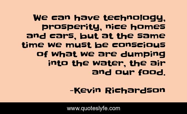 This page presents the quote "We can have technology, prosperity, nice homes and cars, but at the same time we must be conscious of what we are dumping into the water, the air and our food.". Author of this quote is Kevin Richardson. This quote is about food, technology, time,.