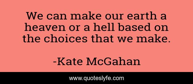 This page presents the quote "We can make our earth a heaven or a hell based on the choices that we make.". Author of this quote is Kate McGahan. This quote is about earth, choice, heaven, hell,.