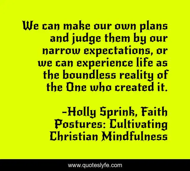 This page presents the quote "We can make our own plans and judge them by our narrow expectations, or we can experience life as the boundless reality of the One who created it.". Author of this quote is Holly Sprink, Faith Postures: Cultivating Christian Mindfulness. This quote is about god, christianity, reality, expectations, mindfulness,.
