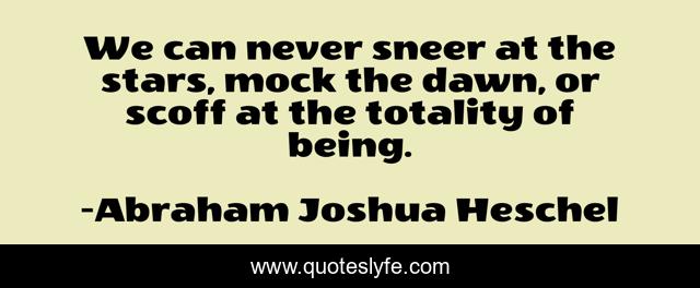 This page presents the quote "We can never sneer at the stars, mock the dawn, or scoff at the totality of being.". Author of this quote is Abraham Joshua Heschel. This quote is about appreciation, life, wonder,.