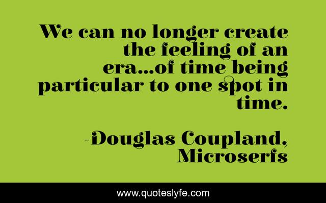 This page presents the quote "We can no longer create the feeling of an era...of time being particular to one spot in time.". Author of this quote is Douglas Coupland, Microserfs. .