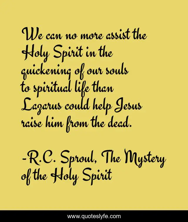 This page presents the quote "We can no more assist the Holy Spirit in the quickening of our souls to spiritual life than Lazarus could help Jesus raise him from the dead.". Author of this quote is R.C. Sproul, The Mystery of the Holy Spirit. This quote is about regeneration, calvinism, theology,.