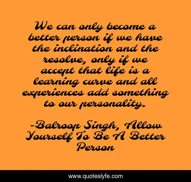 This page presents the quote "We can only become a better person if we have the inclination and the resolve, only if we accept that life is a learning curve and all experiences add something to our personality.". Author of this quote is Balroop Singh, Allow Yourself To Be A Better Person. This quote is about personal-transformation, empowerment, personality,.