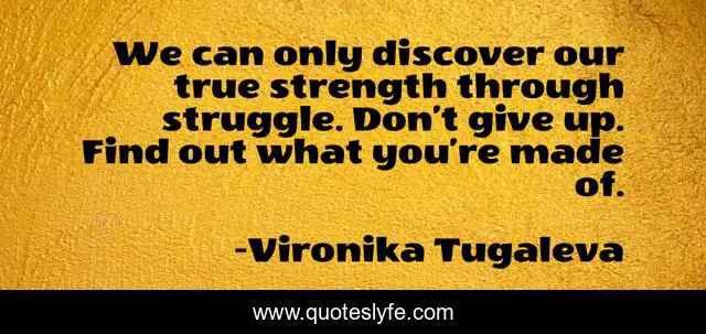 This page presents the quote "We can only discover our true strength through struggle. Don’t give up. Find out what you’re made of.". Author of this quote is Vironika Tugaleva. This quote is about strength, struggle, true-strength, don-t-give-up, heal-yourself, healing,.