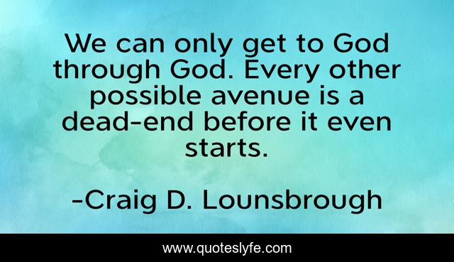 This page presents the quote "We can only get to God through God. Every other possible avenue is a dead-end before it even starts.". Author of this quote is Craig D. Lounsbrough. This quote is about map, dead-end, redeemed, god, reclaimed, through, course, redeem, journey,.