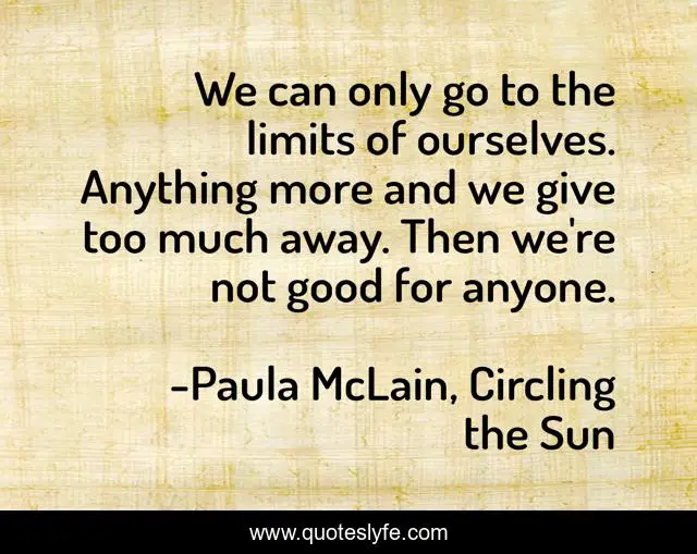 This page presents the quote "We can only go to the limits of ourselves. Anything more and we give too much away. Then we're not good for anyone.". Author of this quote is Paula McLain, Circling the Sun. This quote is about paula-mclain, africa, karen-blixen, kenya,.