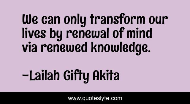 This page presents the quote "We can only transform our lives by renewal of mind via renewed knowledge.". Author of this quote is Lailah Gifty Akita. This quote is about confidence, self-confidence, knowledge, positive, motivational, mind, optimistic, life-lessons, transformation,.