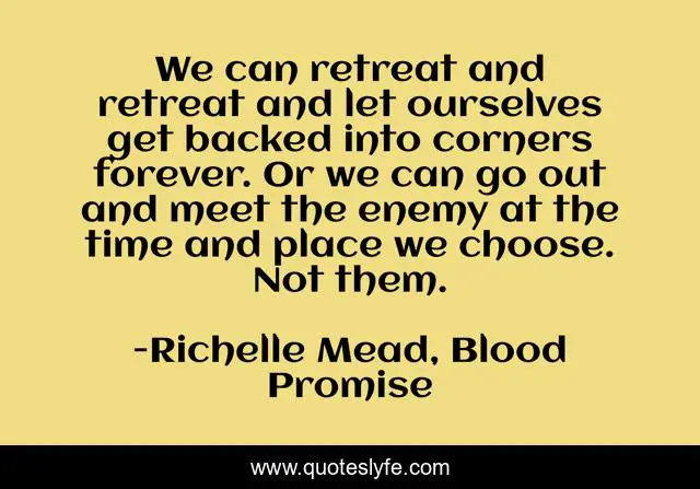 This page presents the quote "We can retreat and retreat and let ourselves get backed into corners forever. Or we can go out and meet the enemy at the time and place we choose. Not them.". Author of this quote is Richelle Mead, Blood Promise. This quote is about life, enemies,.