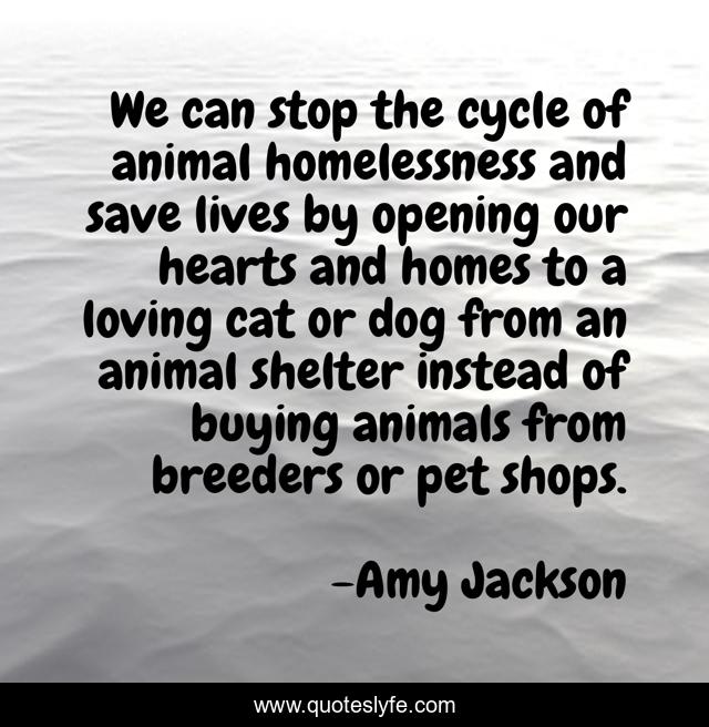 This page presents the quote "We can stop the cycle of animal homelessness and save lives by opening our hearts and homes to a loving cat or dog from an animal shelter instead of buying animals from breeders or pet shops.". Author of this quote is Amy Jackson. This quote is about animals, dog, animal,.