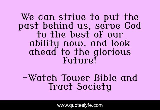 This page presents the quote "We can strive to put the past behind us, serve God to the best of our ability now, and look ahead to the glorious future!". Author of this quote is Watch Tower Bible and Tract Society. This quote is about jehovah, god, jw, future, inspirational, enthusiasm,.