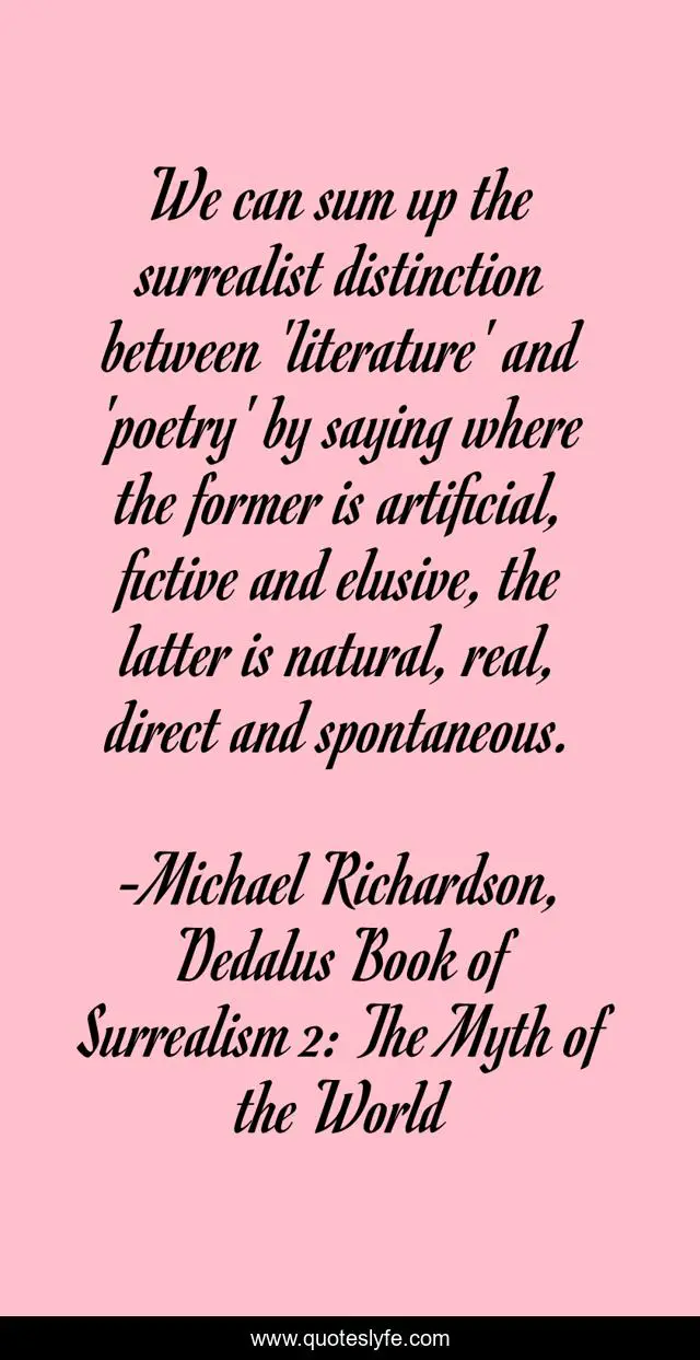 This page presents the quote "We can sum up the surrealist distinction between 'literature' and 'poetry' by saying where the former is artificial, fictive and elusive, the latter is natural, real, direct and spontaneous.". Author of this quote is Michael Richardson, Dedalus Book of Surrealism 2: The Myth of the World. This quote is about surrealism, literature, poetry,.