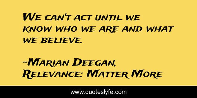 This page presents the quote "We can't act until we know who we are and what we believe.". Author of this quote is Marian Deegan, Relevance: Matter More. This quote is about matter-more, what-we-believe, believe-and-acheive, who-we-are, act, relevance, believe,.