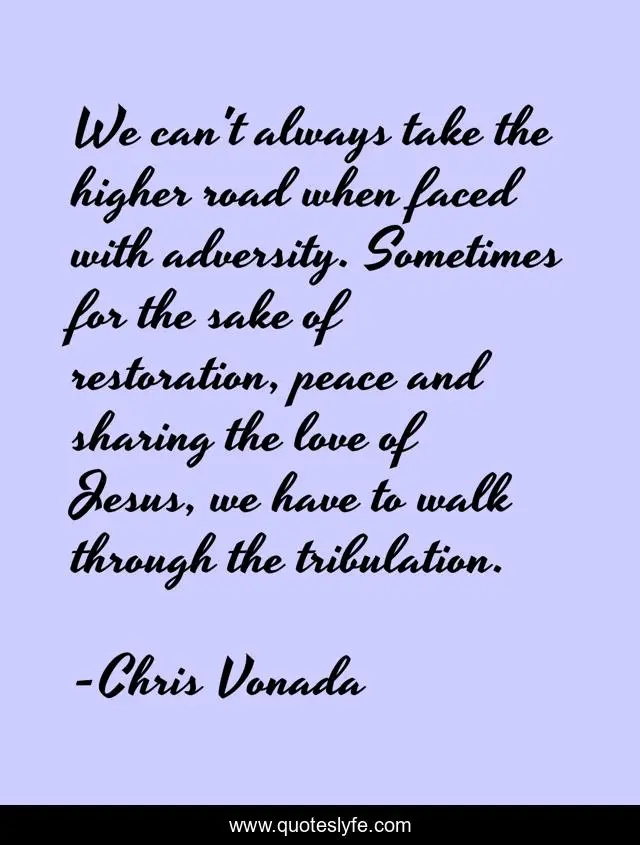 This page presents the quote "We can't always take the higher road when faced with adversity. Sometimes for the sake of restoration, peace and sharing the love of Jesus, we have to walk through the tribulation.". Author of this quote is Chris Vonada. This quote is about love, peace, tribulation, adversity, affection, inspiration,.