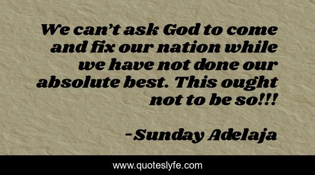 This page presents the quote "We can’t ask God to come and fix our nation while we have not done our absolute best. This ought not to be so!!!". Author of this quote is Sunday Adelaja. This quote is about ask, fix, best, nation,.