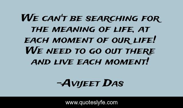 This page presents the quote "We can't be searching for the meaning of life, at each moment of our life! We need to go out there and live each moment!". Author of this quote is Avijeet Das. This quote is about moments-of-impact, moments, moments-of-being, life-and-living-life-philosophy, life-and-sayings, moments-of-life, meaning-of-life, moments-of-happiness,.