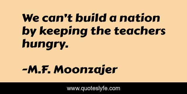 This page presents the quote "We can’t build a nation by keeping the teachers hungry.". Author of this quote is M.F. Moonzajer. This quote is about development, keeping, building-nation, hungry, nation, education,.