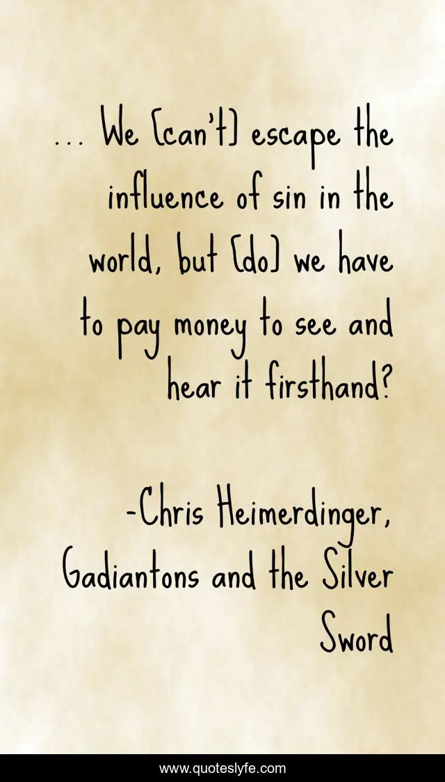 This page presents the quote "... We [can't] escape the influence of sin in the world, but [do] we have to pay money to see and hear it firsthand?". Author of this quote is Chris Heimerdinger, Gadiantons and the Silver Sword. This quote is about rationalization, virtue,.