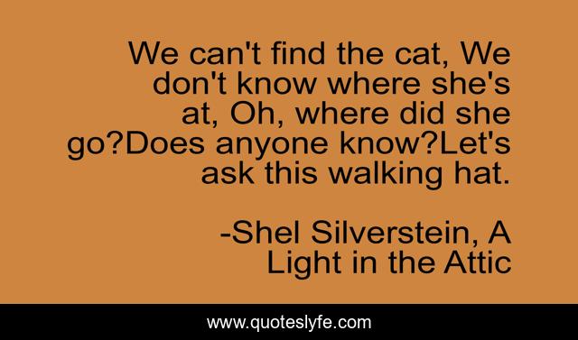 This page presents the quote "We can't find the cat, We don't know where she's at, Oh, where did she go?Does anyone know?Let's ask this walking hat.". Author of this quote is Shel Silverstein, A Light in the Attic. This quote is about poem, cat,.