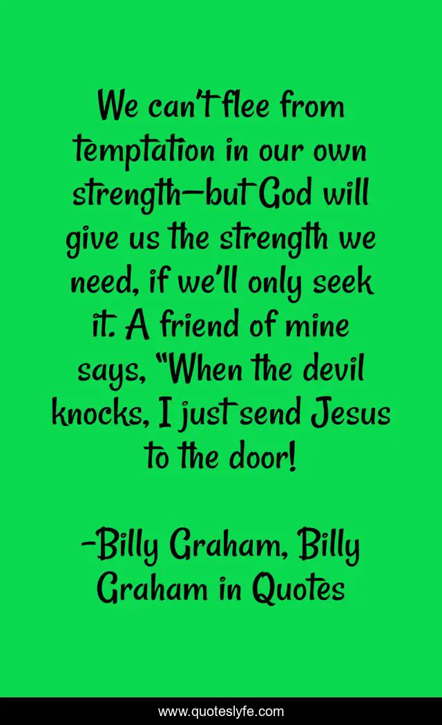 This page presents the quote "We can’t flee from temptation in our own strength—but God will give us the strength we need, if we’ll only seek it. A friend of mine says, “When the devil knocks, I just send Jesus to the door!". Author of this quote is Billy Graham, Billy Graham in Quotes. This quote is about billy-graham, temptation,.