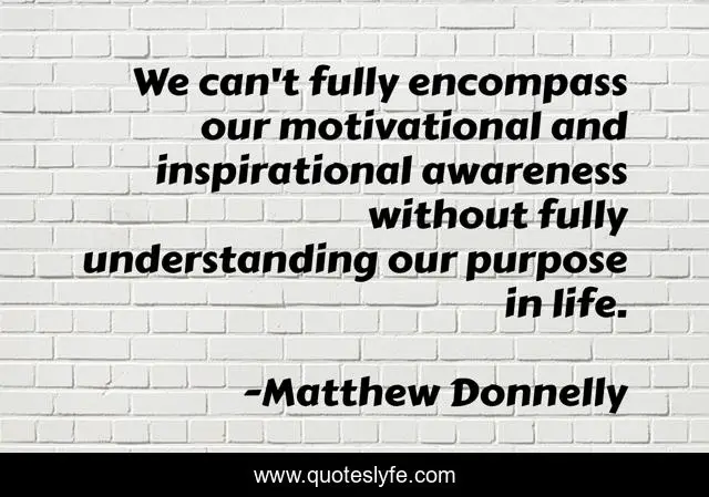 This page presents the quote "We can't fully encompass our motivational and inspirational awareness without fully understanding our purpose in life.". Author of this quote is Matthew Donnelly. This quote is about confidence, personal-growth, positive, motivational, purpose, inspirational, self-help, personal-development, enthusiasm,.