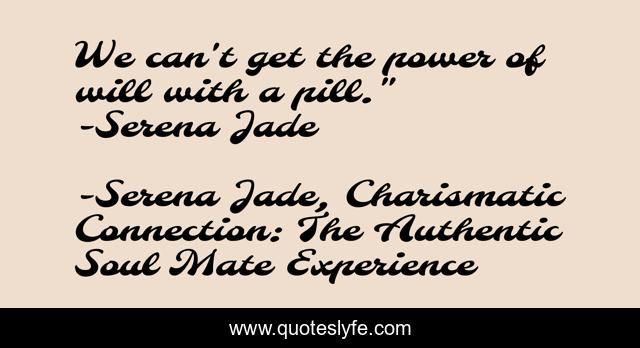 This page presents the quote "We can't get the power of will with a pill." -Serena Jade". Author of this quote is Serena Jade, Charismatic Connection: The Authentic Soul Mate Experience. This quote is about serena-jade, charismatic-connection, soul-mates, personal-growth,.