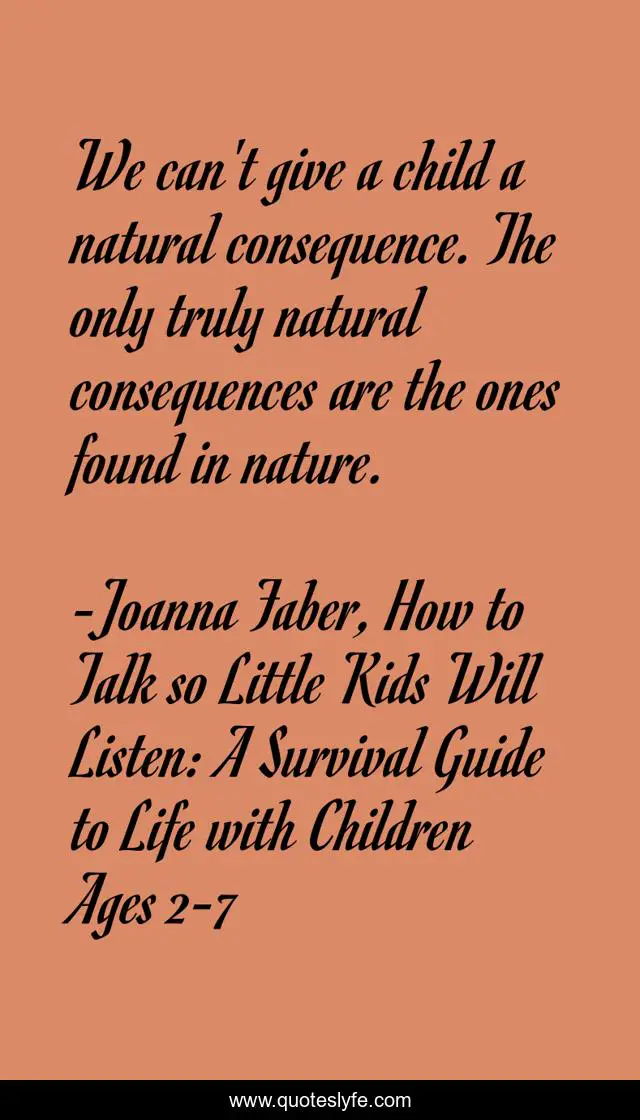 This page presents the quote "We can't give a child a natural consequence. The only truly natural consequences are the ones found in nature.". Author of this quote is Joanna Faber, How to Talk so Little Kids Will Listen: A Survival Guide to Life with Children Ages 2-7. This quote is about parenting, consequences,.