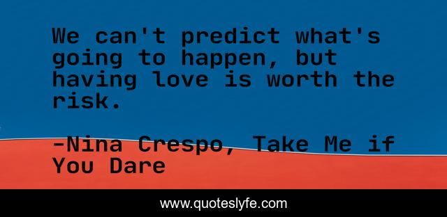 This page presents the quote "We can't predict what's going to happen, but having love is worth the risk.". Author of this quote is Nina Crespo, Take Me if You Dare. This quote is about enthusiasm, humor, contemporary-romance, inspirational,.
