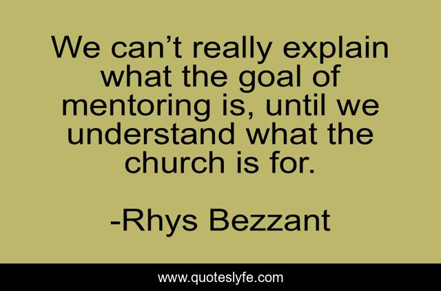 This page presents the quote "We can’t really explain what the goal of mentoring is, until we understand what the church is for.". Author of this quote is Rhys Bezzant. This quote is about discipleship, friendship, leadership,.