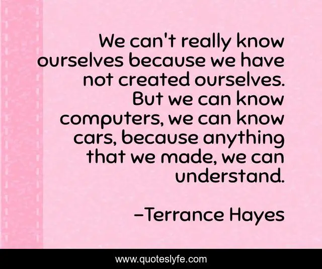 This page presents the quote "We can't really know ourselves because we have not created ourselves. But we can know computers, we can know cars, because anything that we made, we can understand.". Author of this quote is Terrance Hayes. This quote is about understand, anything,.