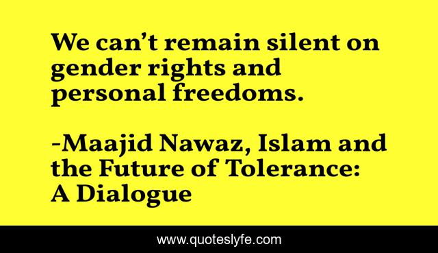 This page presents the quote "We can’t remain silent on gender rights and personal freedoms.". Author of this quote is Maajid Nawaz, Islam and the Future of Tolerance: A Dialogue. This quote is about freedom, gender, islamism,.