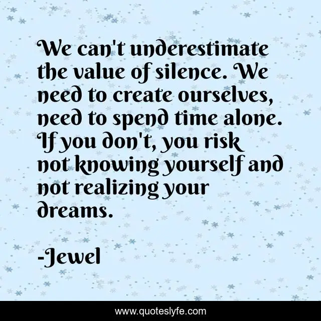 This page presents the quote "We can't underestimate the value of silence. We need to create ourselves, need to spend time alone. If you don't, you risk not knowing yourself and not realizing your dreams.". Author of this quote is Jewel. This quote is about creativity, loneliness, introverts, silence,.