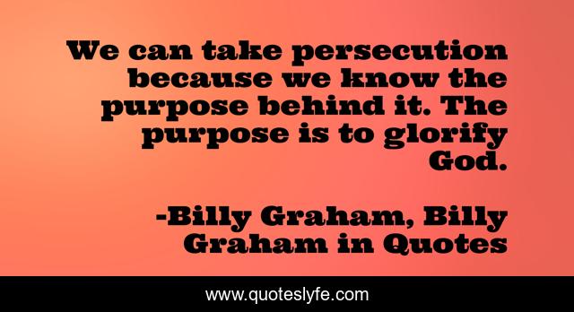 This page presents the quote "We can take persecution because we know the purpose behind it. The purpose is to glorify God.". Author of this quote is Billy Graham, Billy Graham in Quotes. This quote is about persecution, billy-graham,.