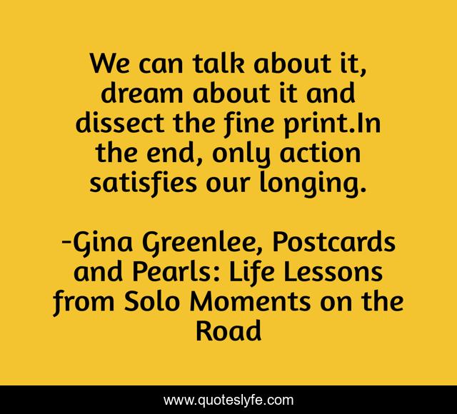 This page presents the quote "We can talk about it, dream about it and dissect the fine print.In the end, only action satisfies our longing.". Author of this quote is Gina Greenlee, Postcards and Pearls: Life Lessons from Solo Moments on the Road. This quote is about confidence, take-action, positive, actions-over-words, motivational, take-actions-on-your-dreams, action-over-thought, satisfaction, just-do-it,.