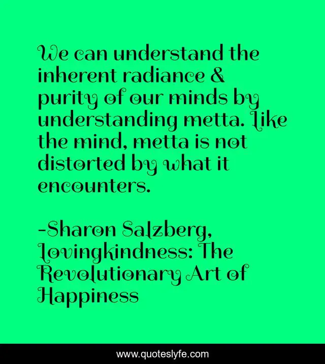 This page presents the quote "We can understand the inherent radiance & purity of our minds by understanding metta. Like the mind, metta is not distorted by what it encounters.". Author of this quote is Sharon Salzberg, Lovingkindness: The Revolutionary Art of Happiness. This quote is about love, psychology, buddhism, inspirational, enthusiasm, meditation, affection,.