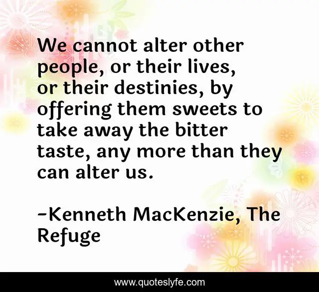 This page presents the quote "We cannot alter other people, or their lives, or their destinies, by offering them sweets to take away the bitter taste, any more than they can alter us.". Author of this quote is Kenneth MacKenzie, The Refuge. .