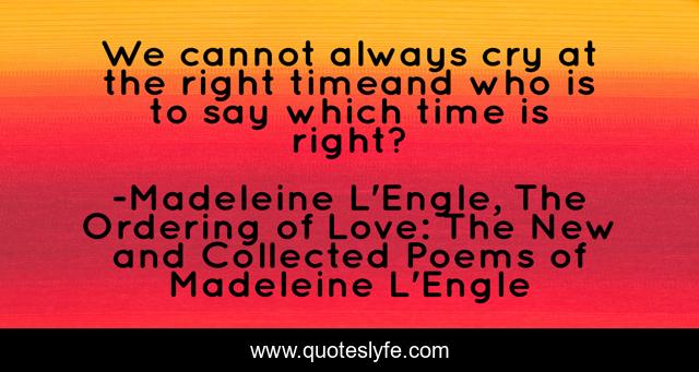 This page presents the quote "We cannot always cry at the right timeand who is to say which time is right?". Author of this quote is Madeleine L'Engle, The Ordering of Love: The New and Collected Poems of Madeleine L'Engle. This quote is about madeleine-l-engle, crying, poetry, right-time,.