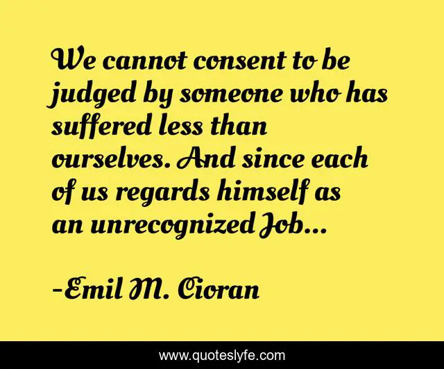 This page presents the quote "We cannot consent to be judged by someone who has suffered less than ourselves. And since each of us regards himself as an unrecognized Job...". Author of this quote is Emil M. Cioran. This quote is about judgement, job, suffering,.
