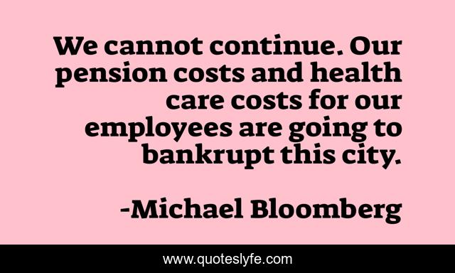 This page presents the quote "We cannot continue. Our pension costs and health care costs for our employees are going to bankrupt this city.". Author of this quote is Michael Bloomberg. This quote is about city, employees, care,.