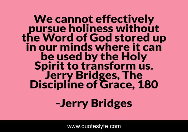 This page presents the quote "We cannot effectively pursue holiness without the Word of God stored up in our minds where it can be used by the Holy Spirit to transform us. Jerry Bridges, The Discipline of Grace, 180". Author of this quote is Jerry Bridges. This quote is about god-s-word, holiness, holy-spirit,.