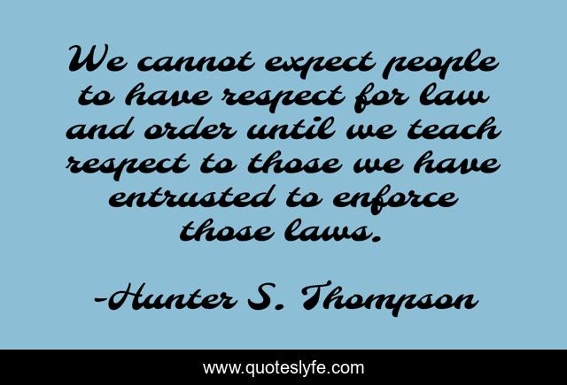 This page presents the quote "We cannot expect people to have respect for law and order until we teach respect to those we have entrusted to enforce those laws.". Author of this quote is Hunter S. Thompson. This quote is about respect, law, expectation, order,.