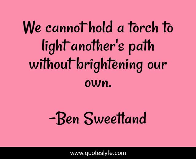 This page presents the quote "We cannot hold a torch to light another's path without brightening our own.". Author of this quote is Ben Sweetland. This quote is about teaching, guidance,.