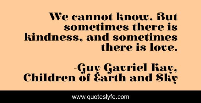 This page presents the quote "We cannot know. But sometimes there is kindness, and sometimes there is love.". Author of this quote is Guy Gavriel Kay, Children of Earth and Sky. This quote is about kindness, love, affection, uncertainty,.