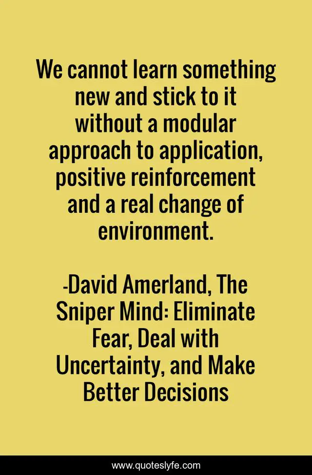 This page presents the quote "We cannot learn something new and stick to it without a modular approach to application, positive reinforcement and a real change of environment.". Author of this quote is David Amerland, The Sniper Mind: Eliminate Fear, Deal with Uncertainty, and Make Better Decisions. This quote is about habits, mind, learning-process,.