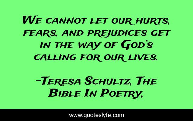 This page presents the quote "We cannot let our hurts, fears, and prejudices get in the way of God’s calling for our lives.". Author of this quote is Teresa Schultz, The Bible In Poetry,. This quote is about god, fear, calling, prejudice, hurt,.